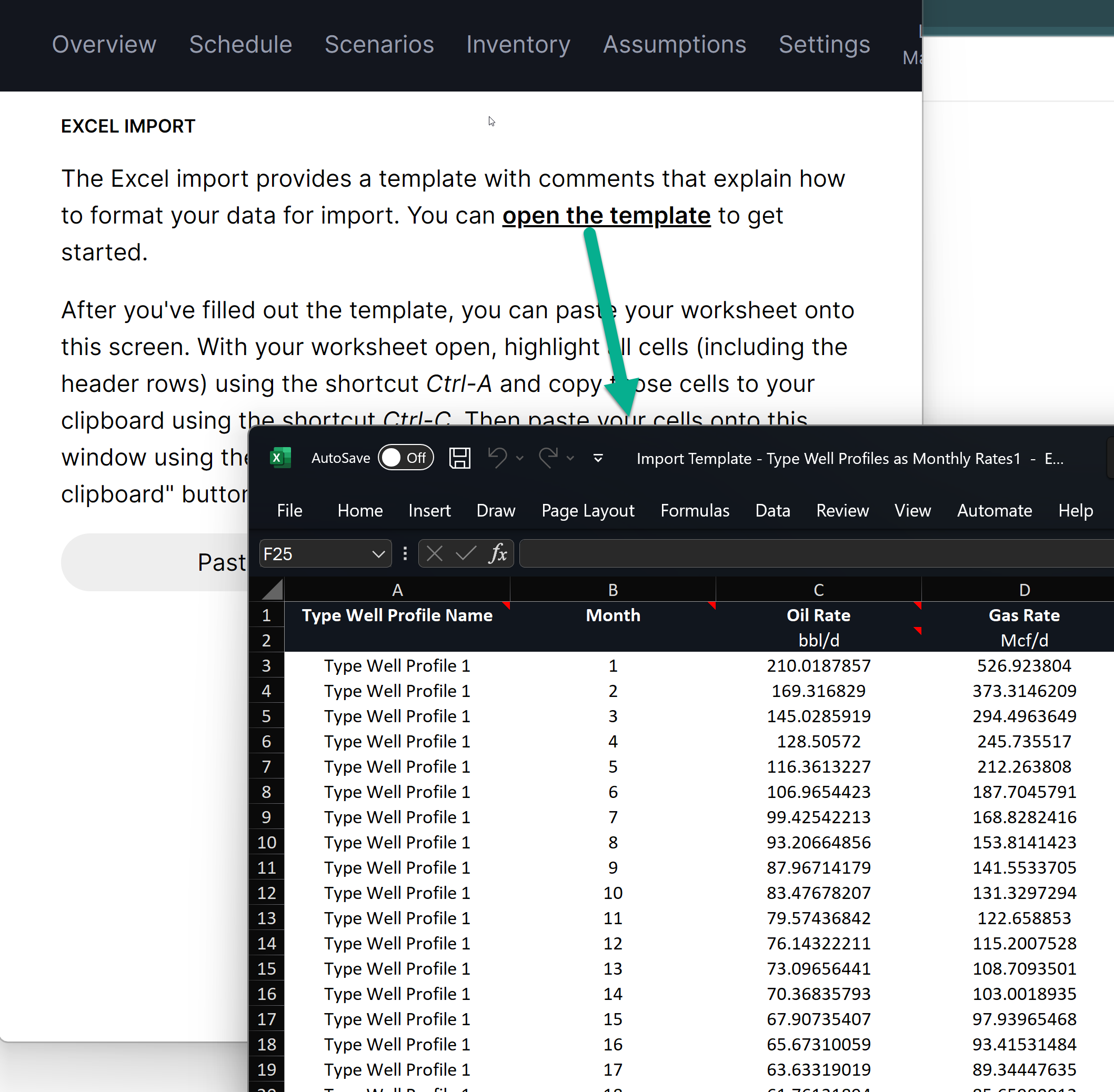 Hit "Import type well profiles as monthly rates" to navigate to the import window where you'll find a downloadable template and instructions.