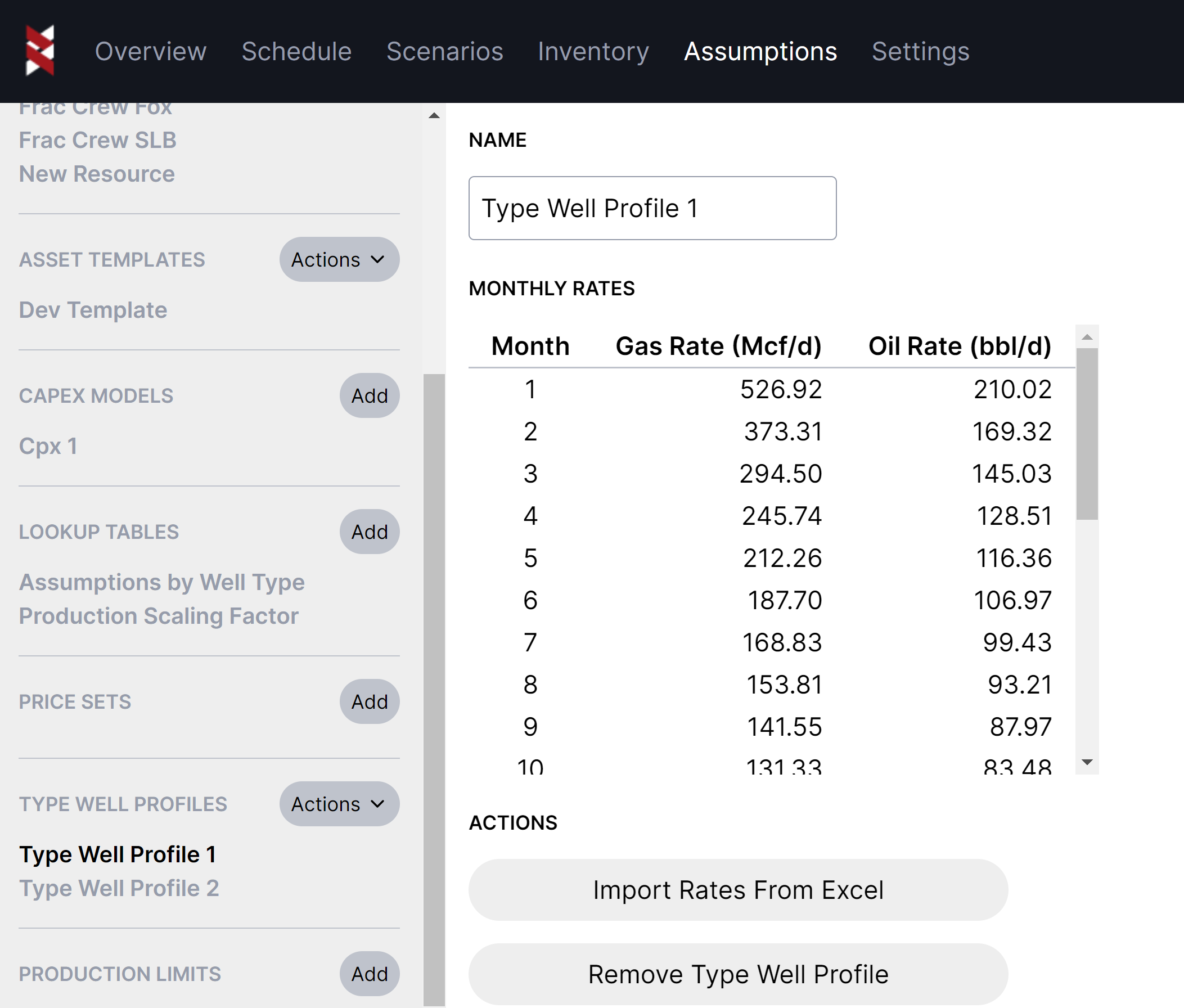 The Planner helps you forecast production using Type Well Profiles, which can be assigned to inventory wells. Production will update in real-time as you adjust scheduling assumptions.