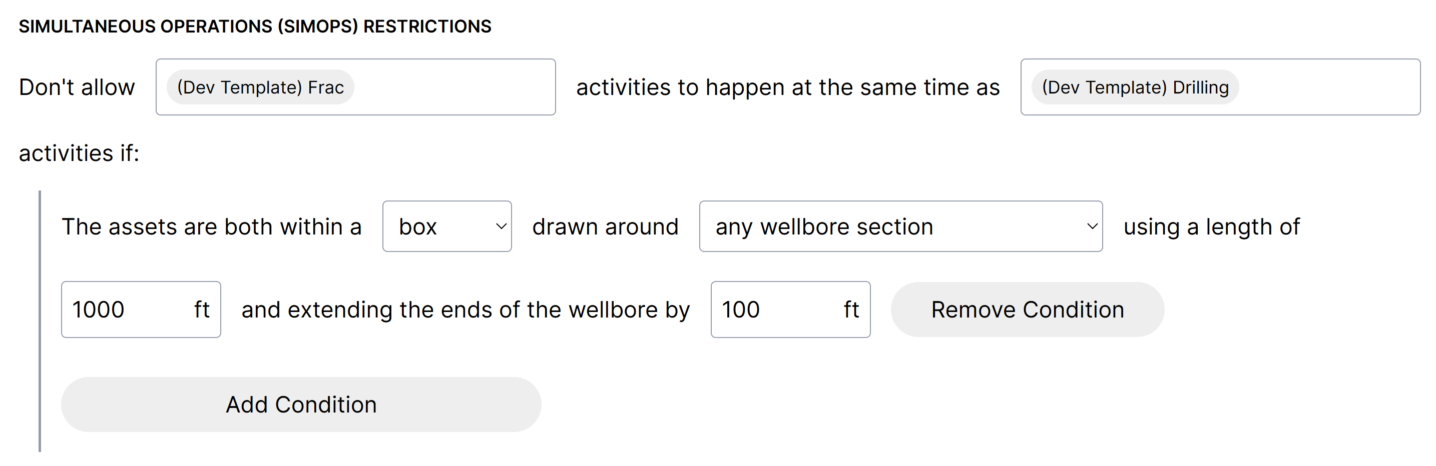 Restrictions are applied based on wellbore distances or other conditions (e.g., nearby frac for the same formation). For example, to avoid fracing while drilling or fracing is happening nearby, it might look something like this: