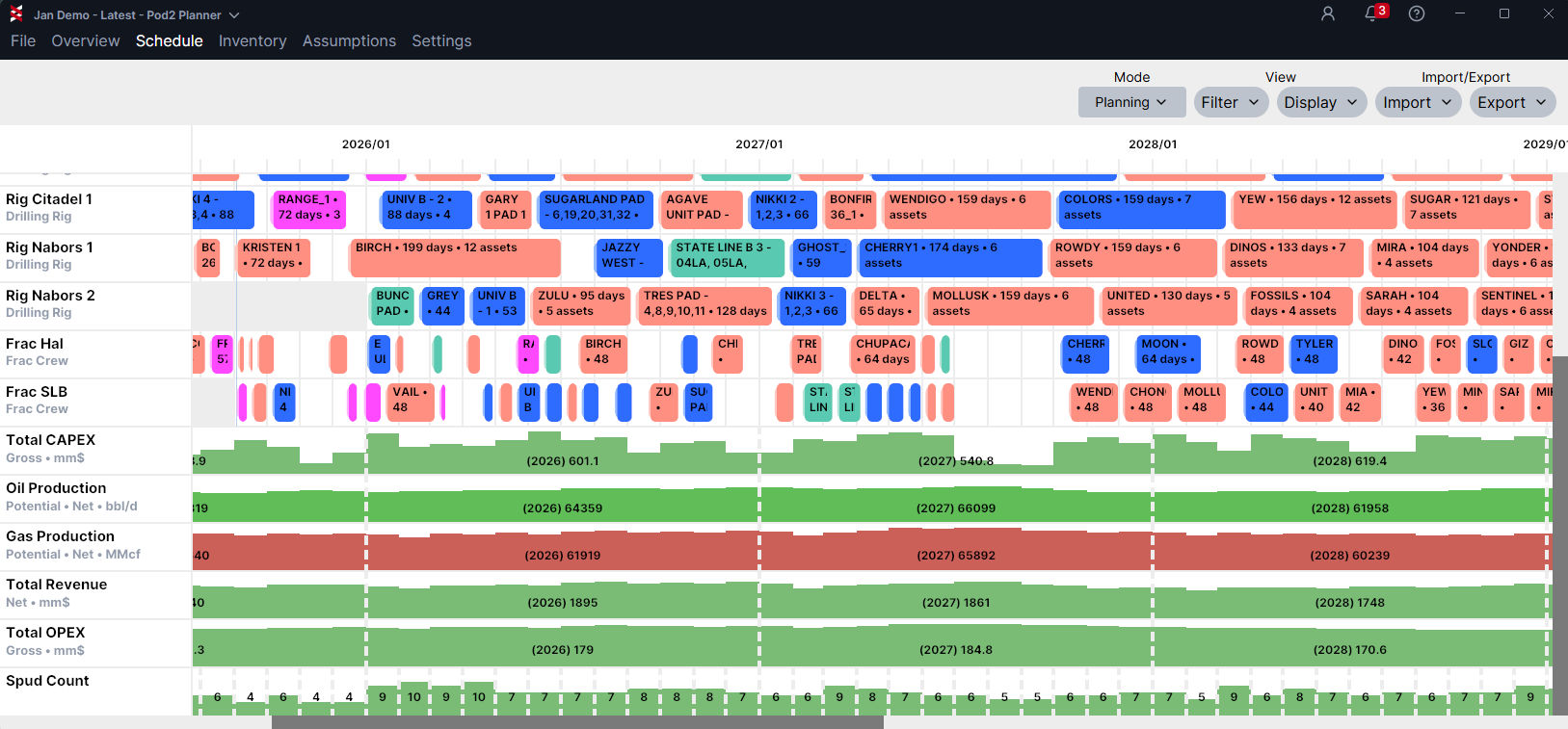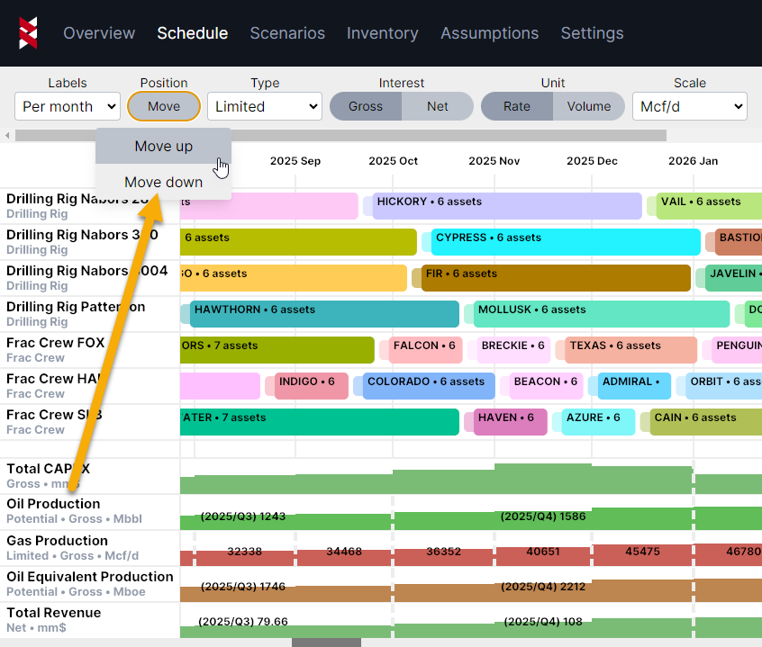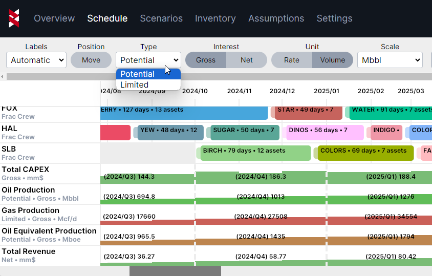 Production can be viewed as Potential or Limited, Gross or Net, Rate or Volume and you can change the scale.