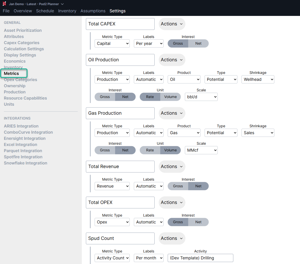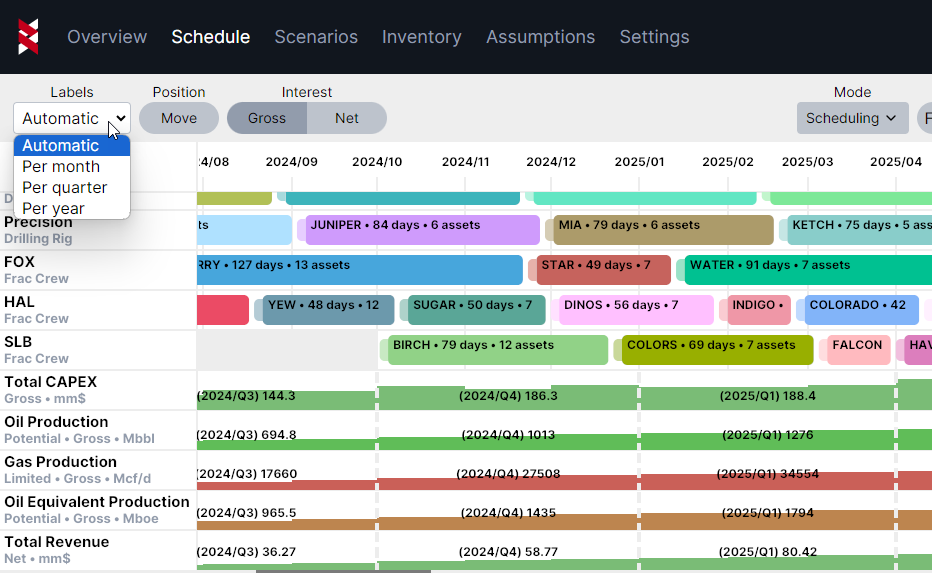 Click on a metric label to expose periodicity, interest, unit and scale options above the Gantt chart.