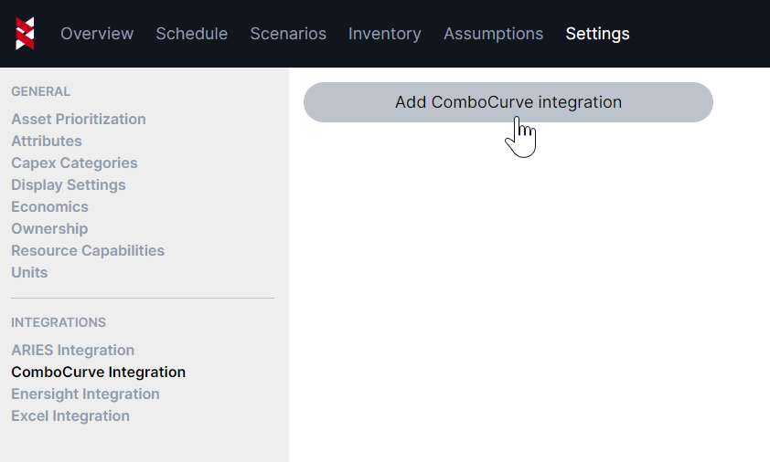Within the Planner, navigate to Settings > Integrations > ComboCurve Integration, hit "Add ComboCurve integration" and enter your credentials