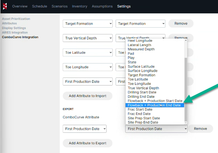 Planner has a two-way integration connection with ComboCurve. A typical use case involves using ComboCurve as the system of record or starting place for your inventory well list, and importing well header data directly into the Planner for scheduling and scenario analysis. Once you have a detailed schedule and realizable plan within the Planner, you can then send schedule data and attributes back to ComboCurve for further production analysis and forecasting.
