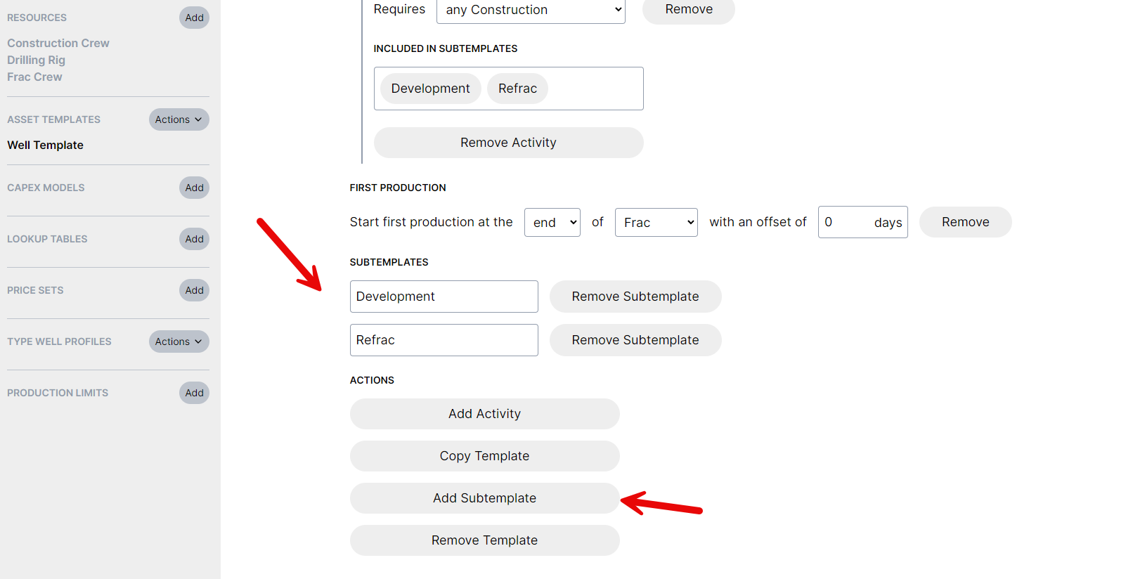 Subtemplates allow you to specify a subset of activities to be used from an asset template. In this example, you could have a single asset template containing all development activities, you can think of this as a master template. Then a subtemplate could allow refracs to only use the frac activities from that template.