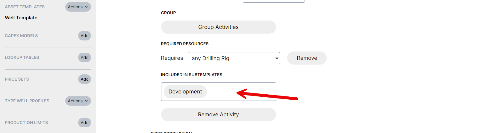- For each activity, you can specifiy which subtemplates the activity applies to. So for Drilling, you can select just development to have only development wells be drilled