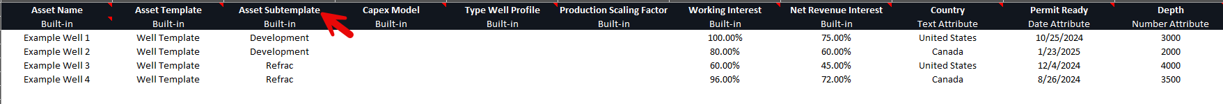 - Finally, apply the correct subtemplate to each well - In your excel import, add an 'Asset Subtemplate' column. If you don't have an excel file you are working with, a quick way to create an import file is to use the 'Export Attributes' export from the Schedule tab, and then add columns for asset template and asset subtemplate to the excel file.