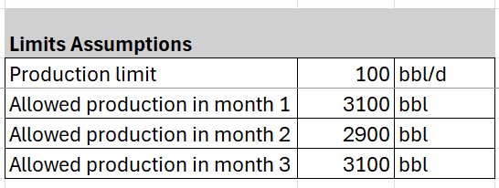 Production limits are volume-based. In this example, the 100 bbl/d limit applied for January, February, and March results in the following allowed volumes: