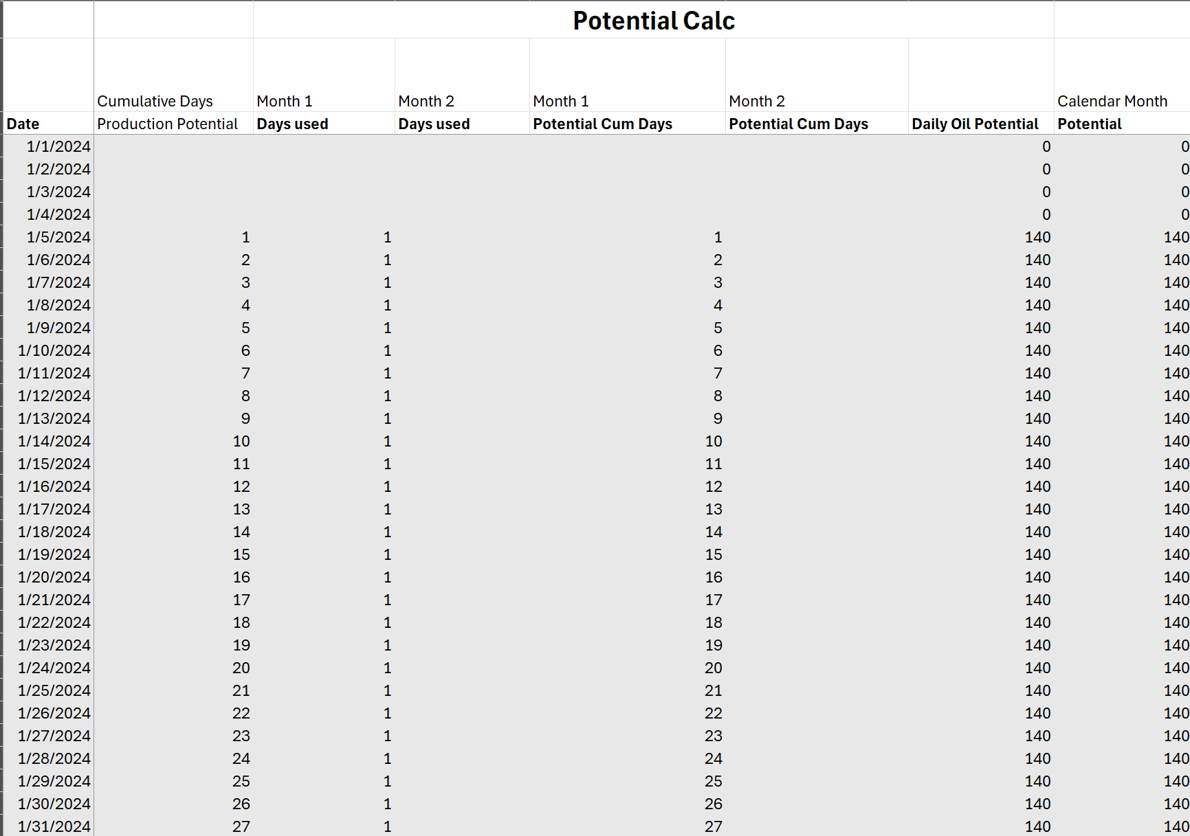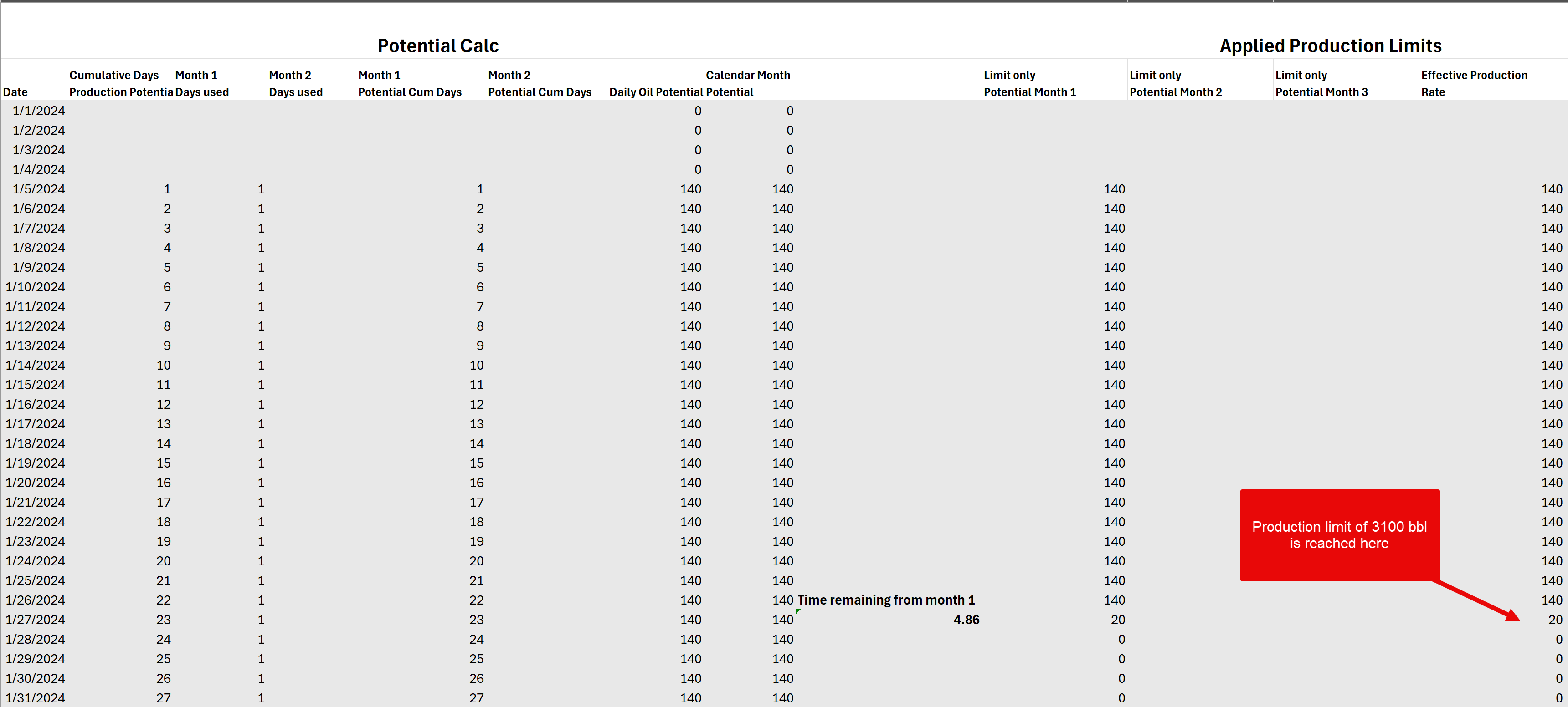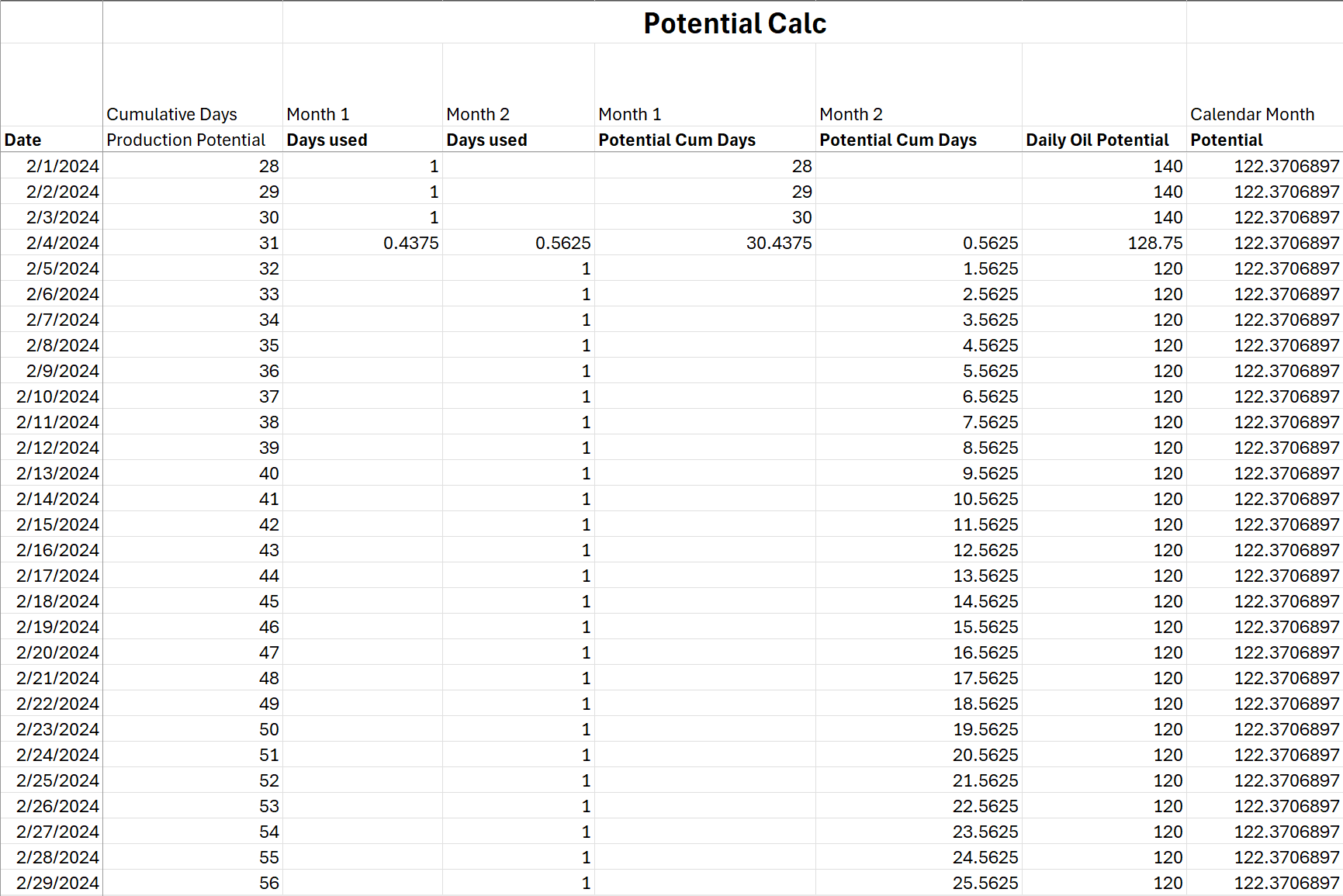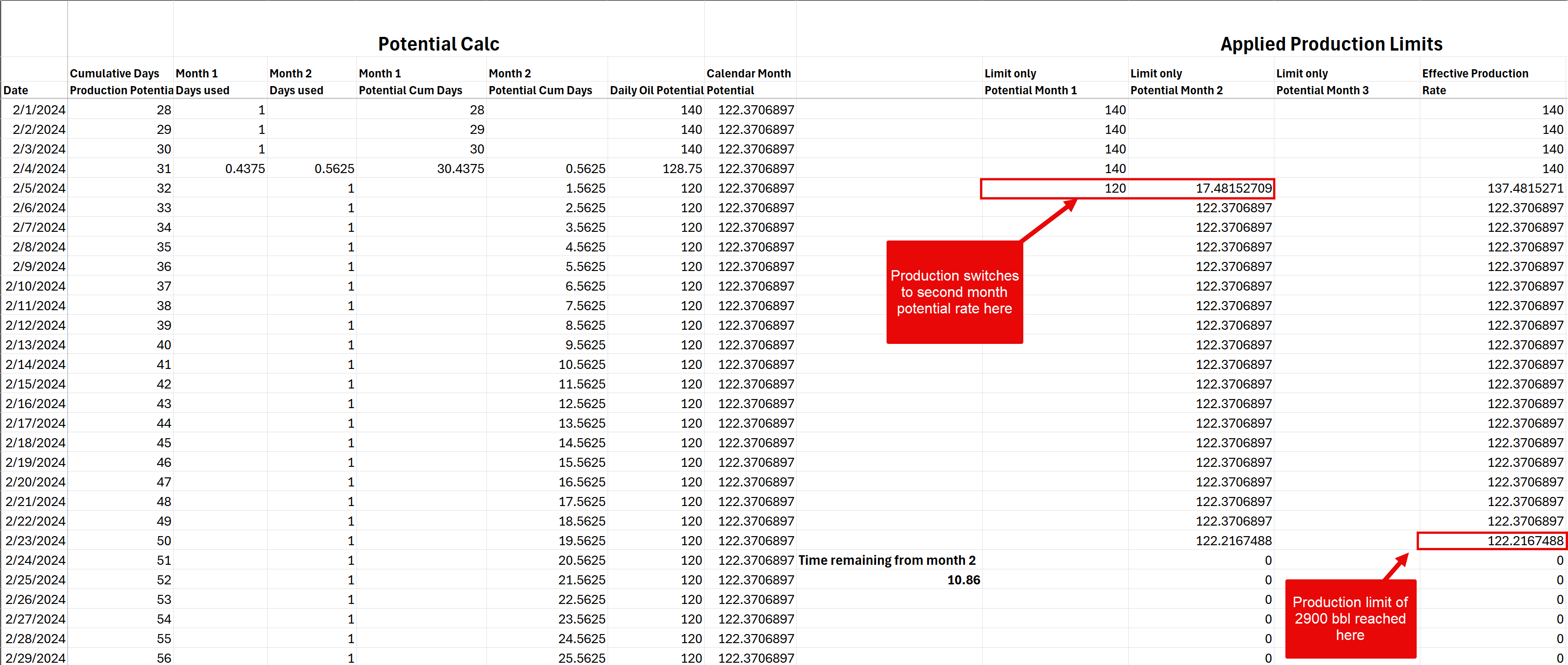 In February, there are ~4.86 days of the first month's potential of 140 bbl/d. Production then switches to the second month potential of 122.37 bbl/d until the limit of 2900 bbl is reached