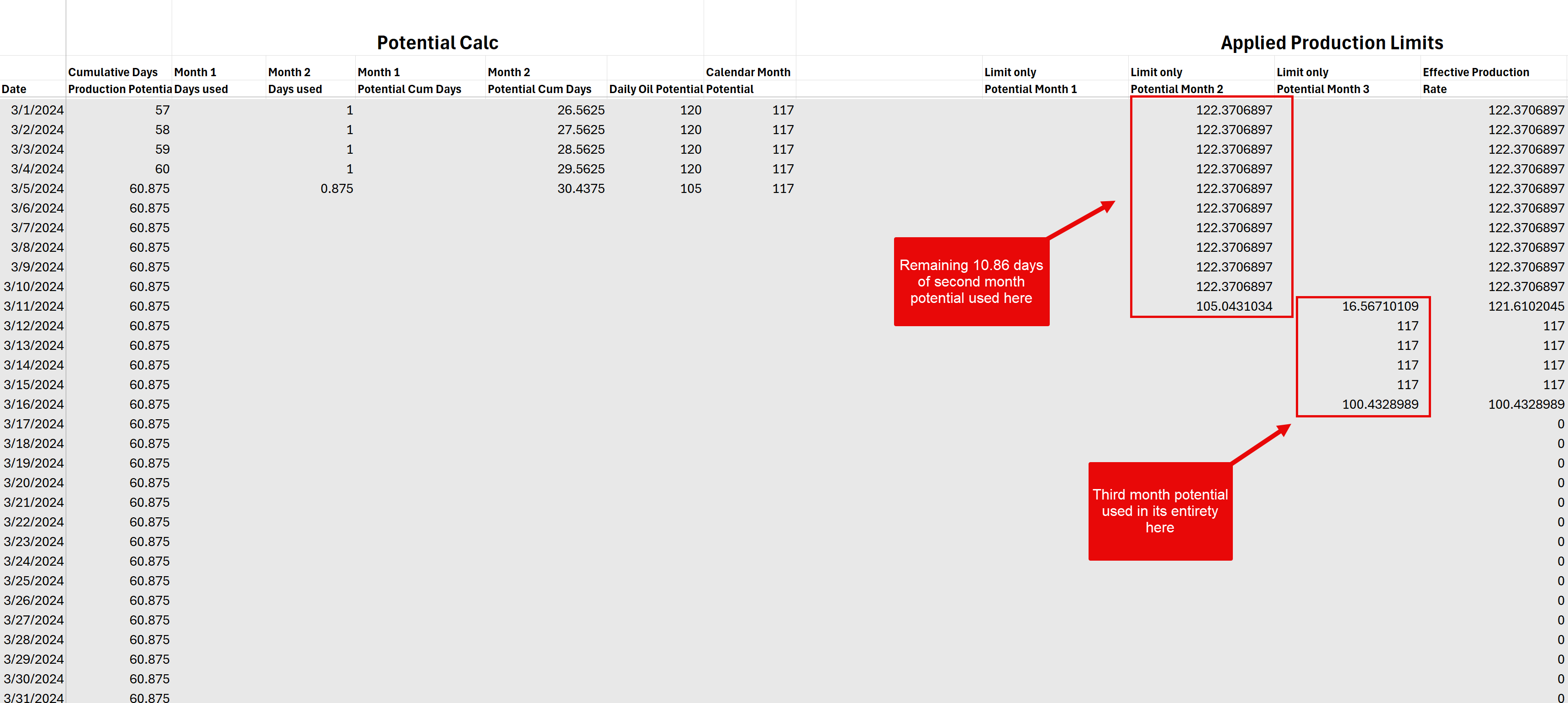 In March, there are 10.86 days left of the second month potential, followed by the entirety of the third month potential production. The production limit of 3100 bbl for March is not reached here