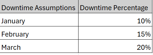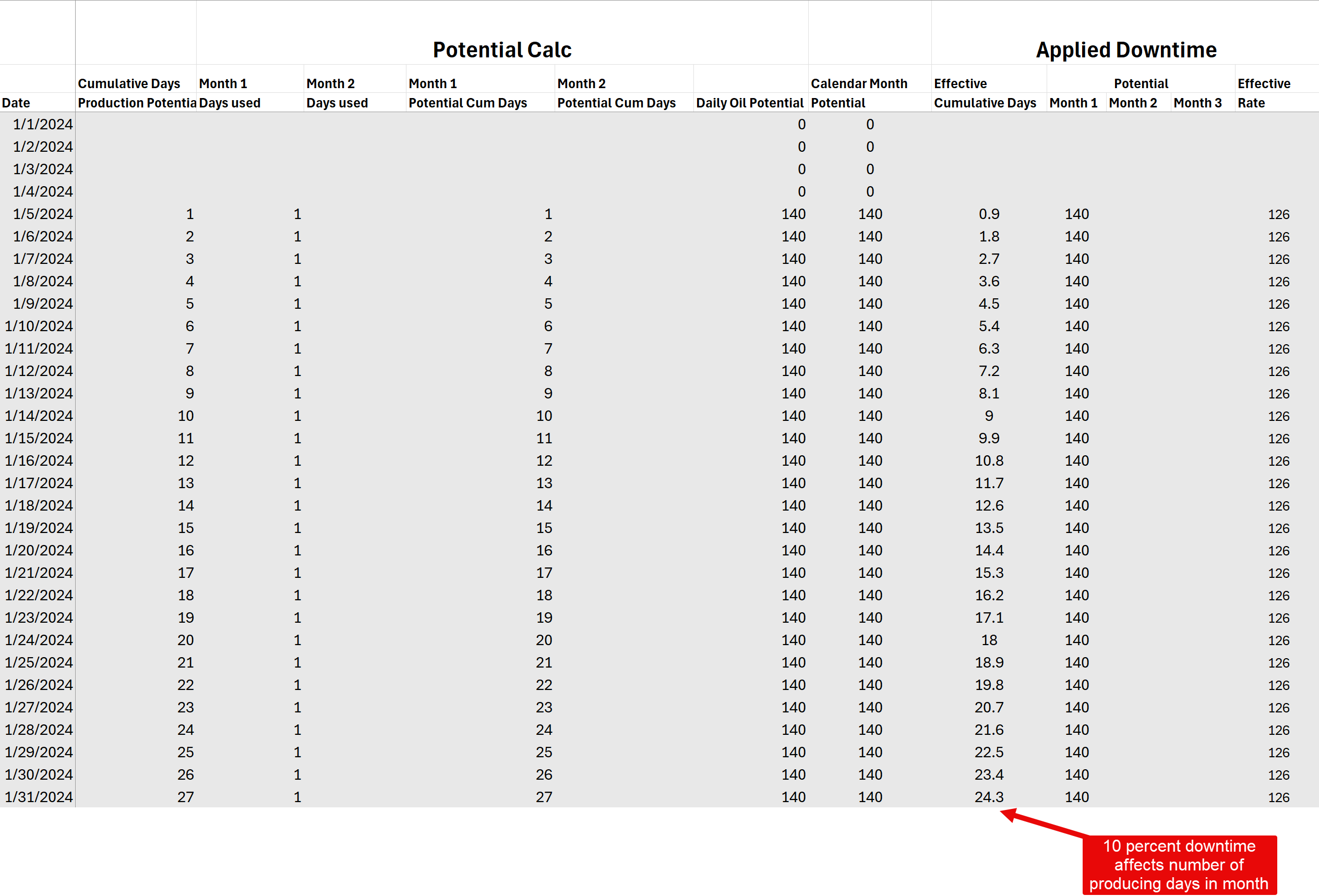 For January, a 10 percent downtime is applied starting on the first production date of January 5th. This results in 24.3 total days of production in January instead of the potential production of 27 days