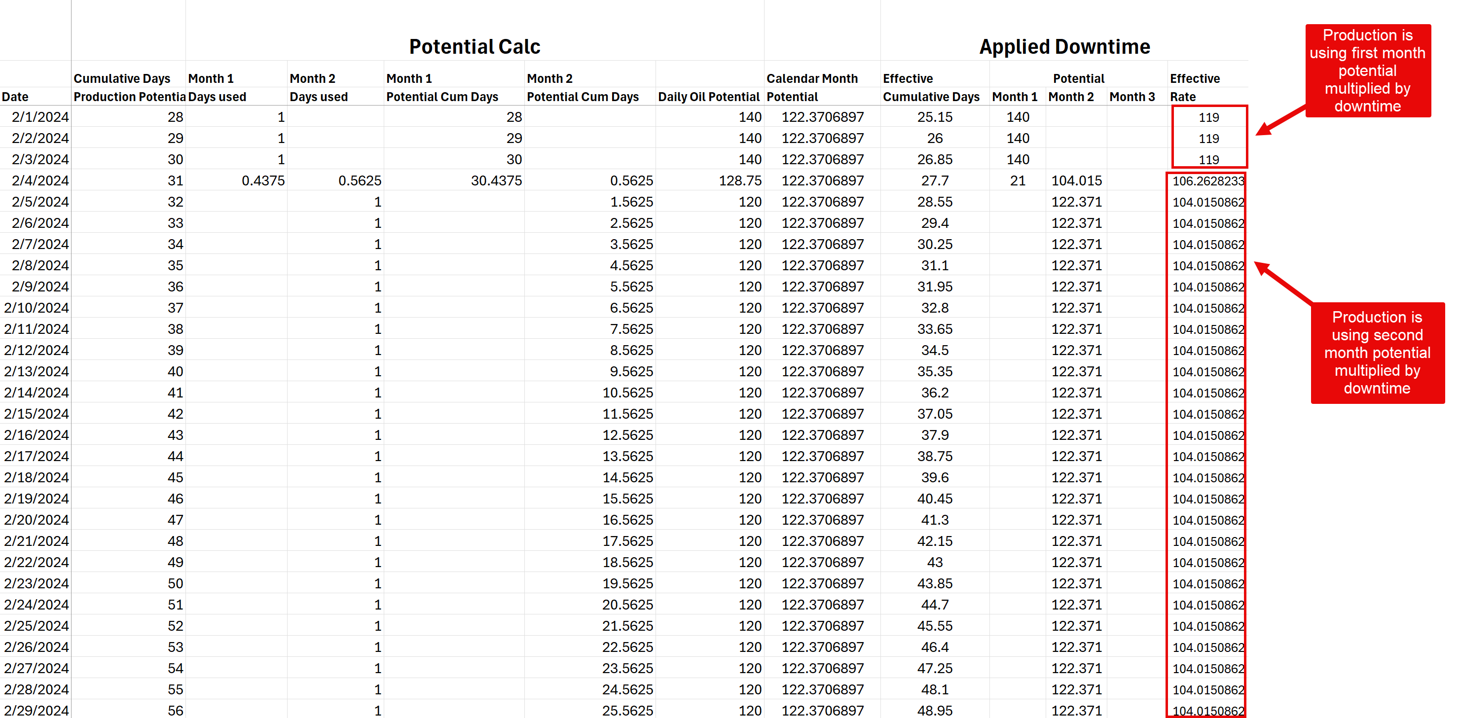 For February, there are 3.15 days left in the first month potential so the first rate shown is 140*(1-0.15) = 119 bbl/d, and then production switches to the second month potential of 122.37 resulting in an effective rate of 122.37*(1-0.15) = 104.02 bbl/d