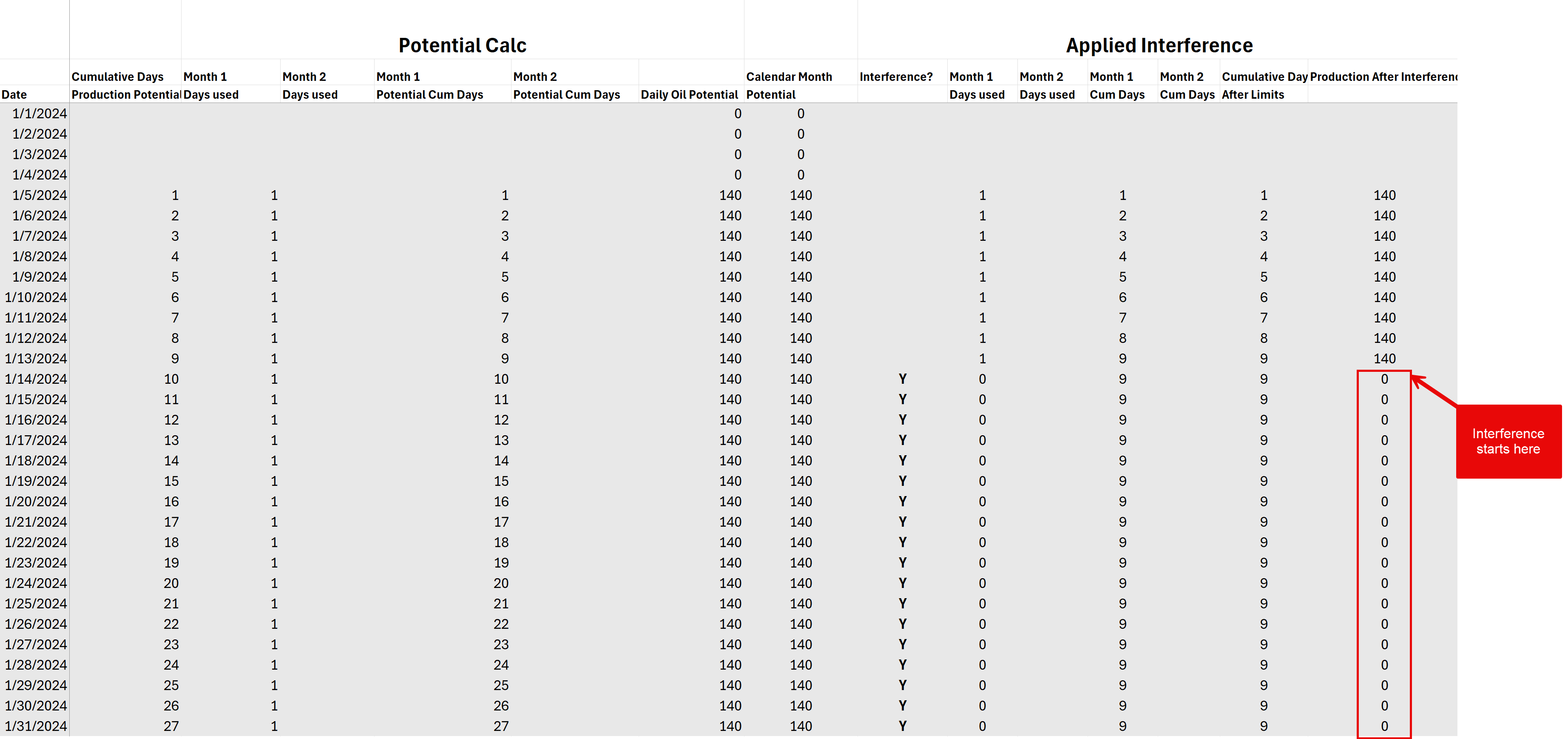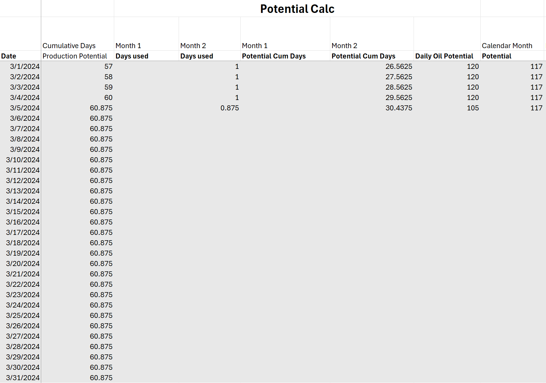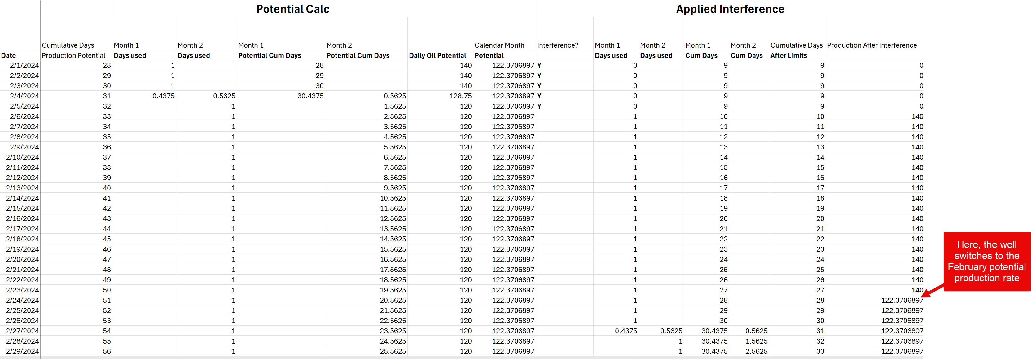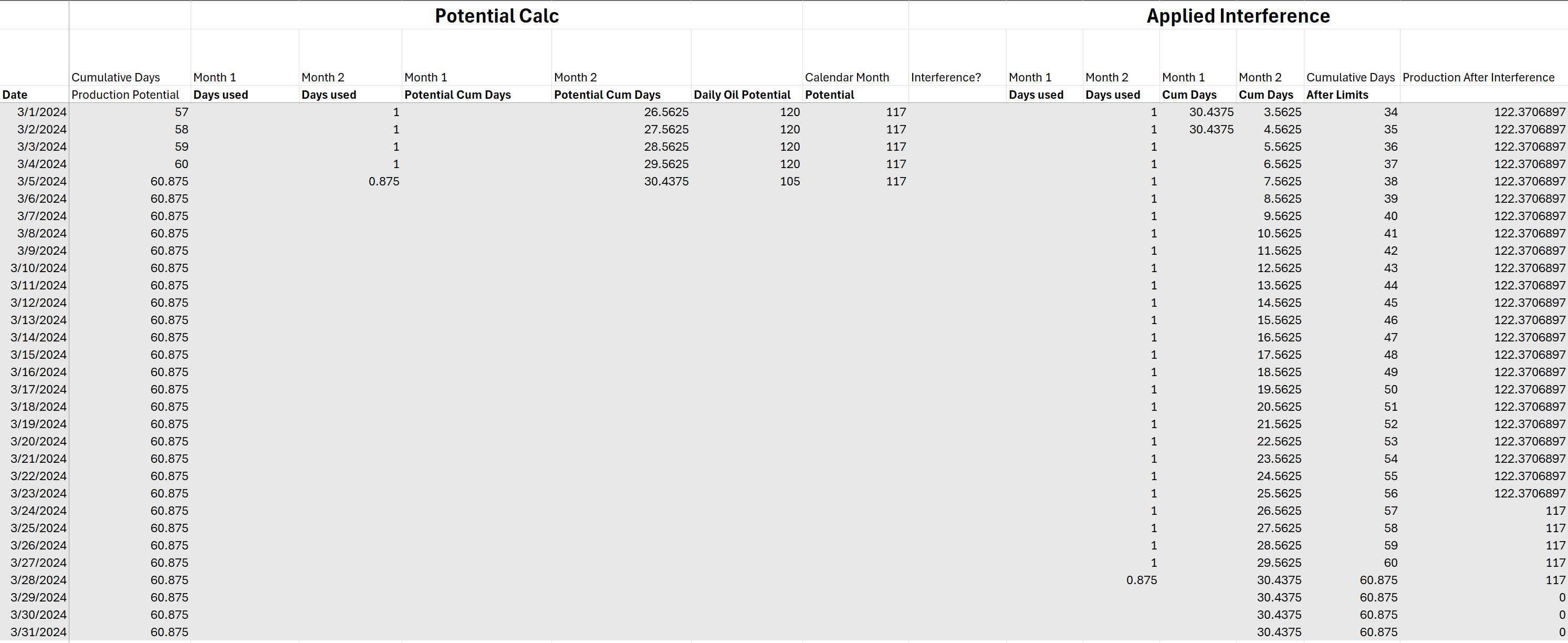 For March, there is no more interference, so the well produces for 23 more days of the February potential (122.371 bbl/d) and then produces for 5 days of the March potential (117 bbl/d)