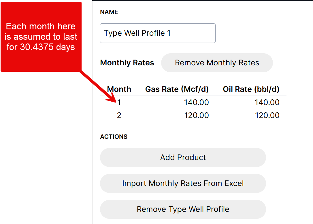 When inputting production forecast data using monthly rates, the months are assumed to represent 30.4375 days, and are then allocated to the calendar months based on first production date.