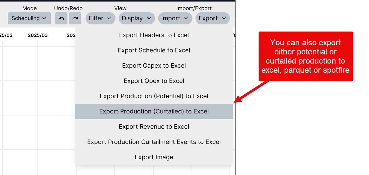When viewing production results in Planner, you can choose between potential or curtailed production. Potential production shows results without any curtailment applied, while curtailed production includes all applied curtailment.